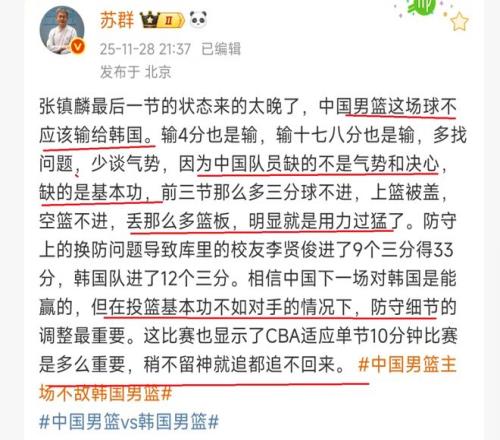 輸韓國(guó)4分!蘇群中肯點(diǎn)評(píng),指出了中國(guó)男籃輸球的主要原因